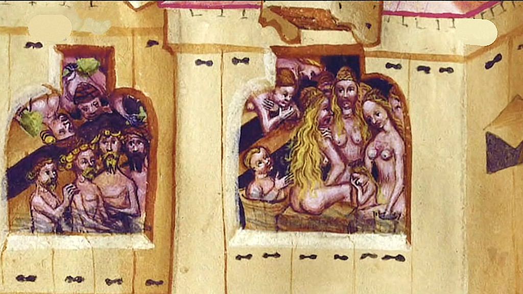 Погружаемся в глубь веков. Во времена Средневековья Церковь навязывала невыполнимые нормы поведения. Их было тяжело выполнять даже священнослужителям. Найдена керамика, на которой монах бесцеремонно засунул руку под юбку женщине. Это примерно XV век. Люди тогда знали, как обойти установленные нормы поведения. В банях и купальнях мужчины и женщины проводили время вместе, без всяких ограничений. Позже эти заведения были закрыты из-за эпидемии сифилиса.