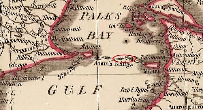 Пешеходный мост от южной оконечности Индии до севера Шри-Ланки функционировал вплоть до 1480 года, когда был разрушен землетрясением и частично затоплен. Песчаная коса, протянувшаяся от индийского города Рамешварам до ланкийского северного побережья, прекрасно видна как из космоса, так и с борта самолета. Глубина отмели варьируется от полутора метров до нескольких сантиметров. Практически, из Индии можно пешком уйти на Цейлон, бредя в воде по пояс, за исключением небольшого участка в полтора километра, где глубина существеннее.